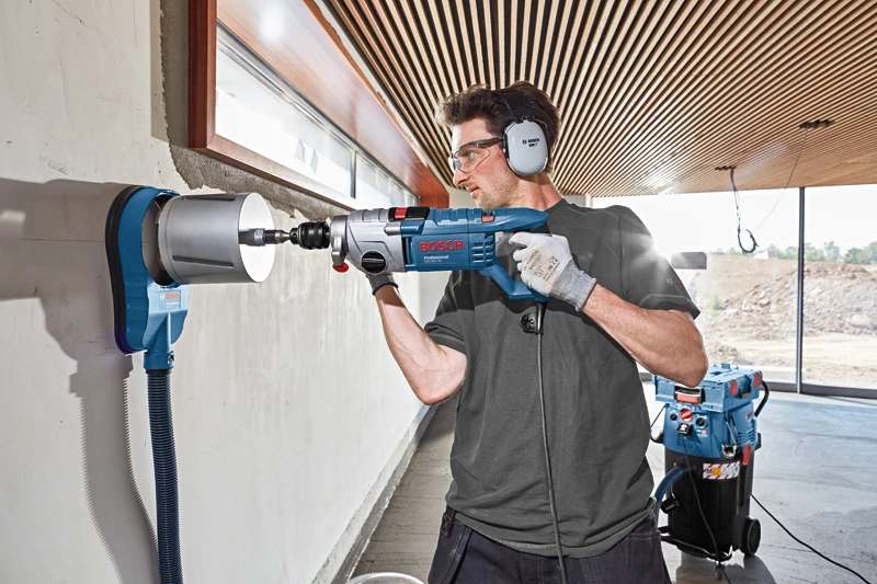 Absaugvorrichtung für verschiedene Bohrmaschinen GDE 162. Die praktische und universelle Staubabsaugung für Hohlbohrkronen. Für eine saubere Arbeit: weniger nachträgliche Reinigungsarbeiten. Einfache Handhabung: Anschließen an einen Staubsauger genügt. Geräteunabhängig: Funktioniert mit allen bohrenden Maschinen. Keine Montage an der Maschine erforderlich, kein zusätzliches Gewicht an der Maschine. Perfekt abgestimmt auf das Bosch Click und Clean System (direkter Saugeranschluss möglich). Geeignet für Hohlbohrkronen bis zu 162 mm Durchmesser. Auch zur Absaugung bei Nass-Bohrungen sehr gut geeignet.