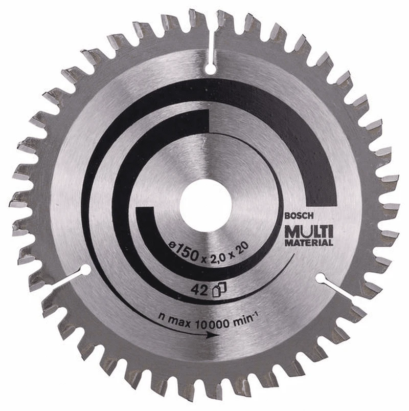 Kreissägeblatt Multi Material für Handkreissägen. Außendurchmesser: 150 mm, Bohrung/Bohrung mit Reduzierring: 20/16 mm, Schnittbreite: 2 mm, Stammblattstärke: 1,4 mm, Zähnezahl: 42, Zahnform: TR-F, Schnittresultat: 4,0. Das perfekte Blatt für kraftvolle Schnitte mit sauberen Schnittkanten in den verschiedensten Materialien. Verwendung des Universalschneidöls 2 607 001 409 erhöht die Standzeit bei Schnitten in Metall z. B. Aluminium um ein Mehrfaches.