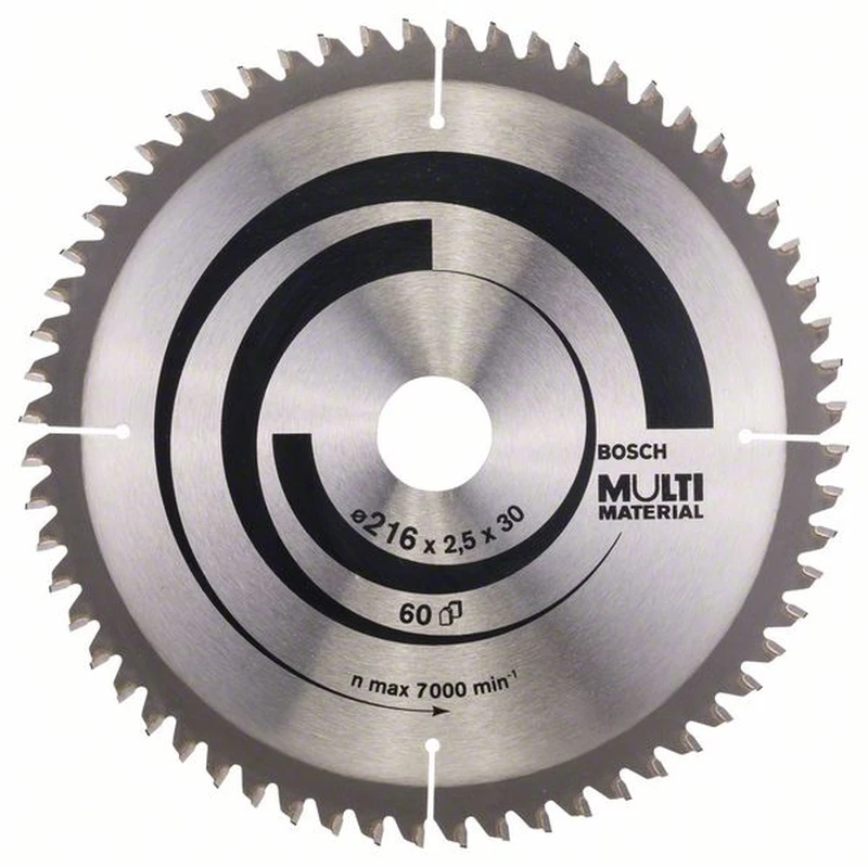 Kreissägeblatt Multi Material für Kapp-, Gehrungs-, und Tischkreissägen. Außendurchmesser: 216 mm, Bohrung: 30 mm, Schnittbreite: 2,5 mm, Zähnezahl: 60. Verwendung des Universalschneidöls 2 607 001 409 erhöht die Standzeit bei Schnitten in Metall z. B. Aluminium um ein Mehrfaches.