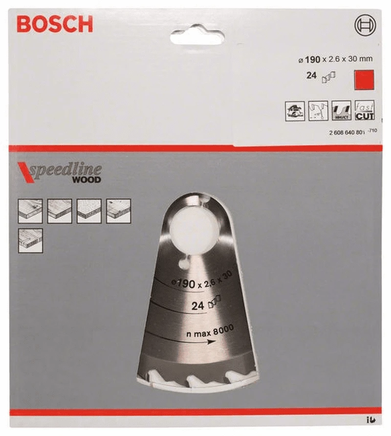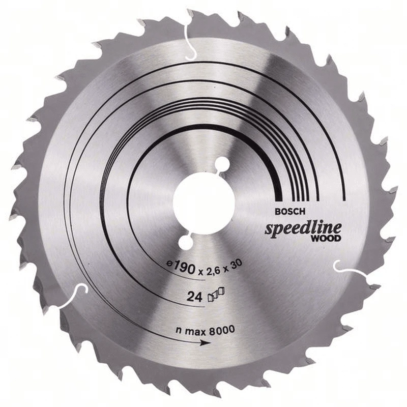 Kreissägeblatt Speedline Wood für Handkreissägen. Außendurchmesser: 190 mm, Bohrung: 30 mm, Schnittbreite: 2,6 mm, Zähnezahl: 24. Das schnelle Blatt für Längs- und Querschnitte in allen Holzarten. Grober Schnitt: Ideal für Weichholz, Hartholz, Spanplatten, Schalungsbretter. Das neue Kreissägeblatt für den schnellen Trennschnitt längs und quer in Holz und Plattenwerkstoffen. Ideal sowohl für grobe Zuschnitte sowie auch für präzise Winkelschnitte. Kontrollierter, weitgehend vibrationsfreier Schnitt durch spezielles Zahndesign (2 konkave Wechselzähne, 1 konkaver Flachzahn).