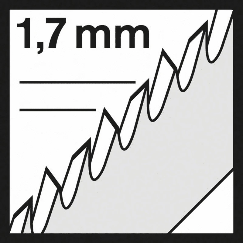 Stichsägeblatt Clean for Hard Wood. Typ: T 101 AIF. Werkstoff: BIM, Zahnausführung: spitzverzahnt, freiwinkel-, zähnegeschliffen. Gesamtlänge: 100 mm, Zahnteilung: 1,7 mm. Einnockenschaft, sauberer Schnitt. Einsatzbereiche: Für Hartholz, Platten, Laminate und beschichtete Platten/HPL von 2 bis 30 mm Stärke, für EFK/Epoxy kleiner als 30 mm Stärke. Kein Ausriss. Inhalt der Verkaufspackung: 3 Stück.