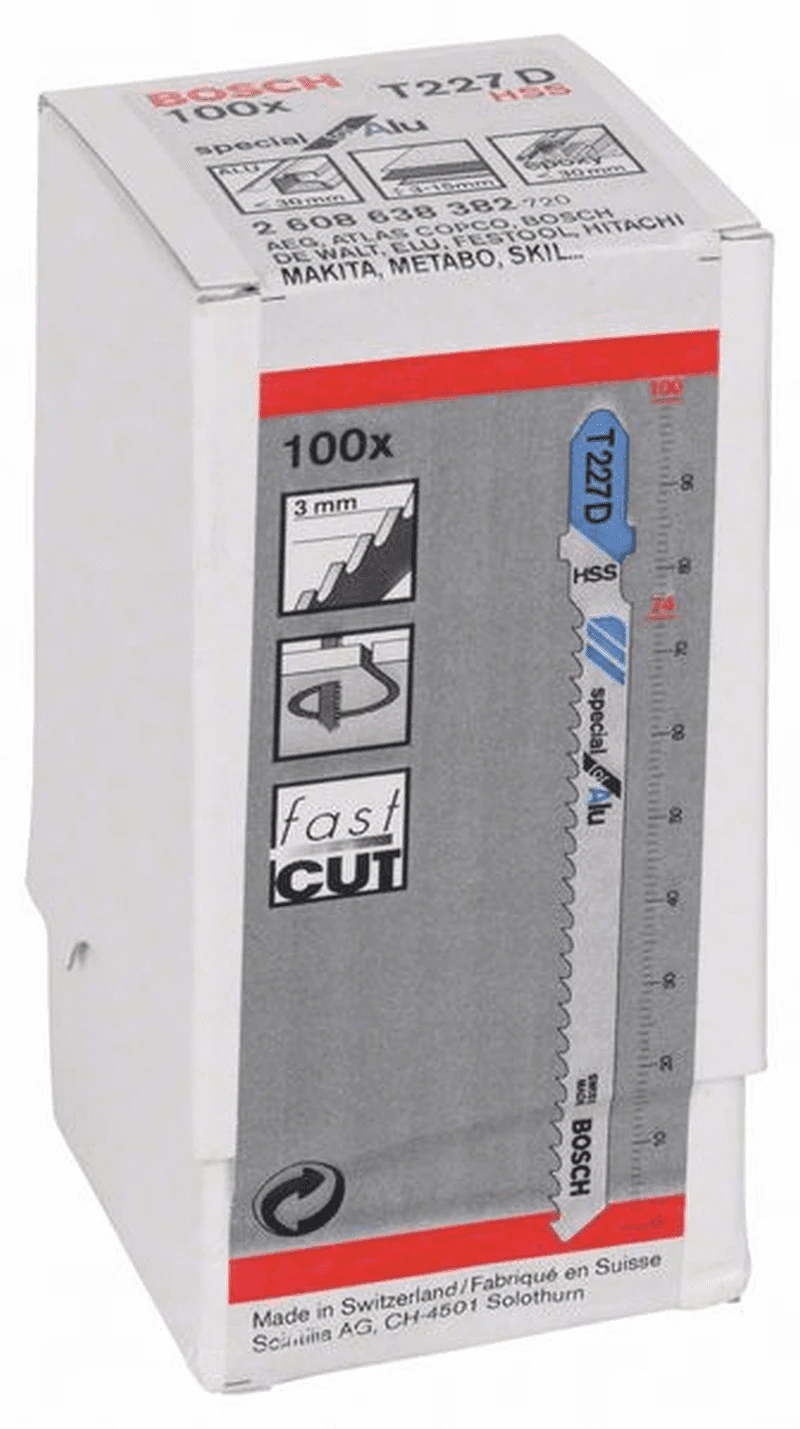 Stichsägeblatt Special for Alu. Typ: T 227 D. Werkstoff: HSS. Zahnausführung: geschränkt, gefräst, Gesamtlänge: 100 mm, Zahnteilung: 3 mm. Einnockenschaft. Für Alu und Buntmetall. Einsatzbereiche: Für dünne bis starke Bleche von 3 bis 15 mm Stärke. Für Rohre und Profile kleiner als 30 mm Stärke. Speziell für Kurvenschnitt. Für Aluminium und GFK/Epoxy kleiner als 30 mm Stärke. Inhalt der Verkaufspackung: 100 Stück.