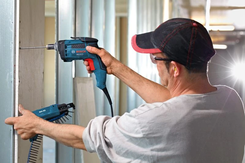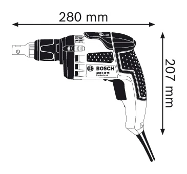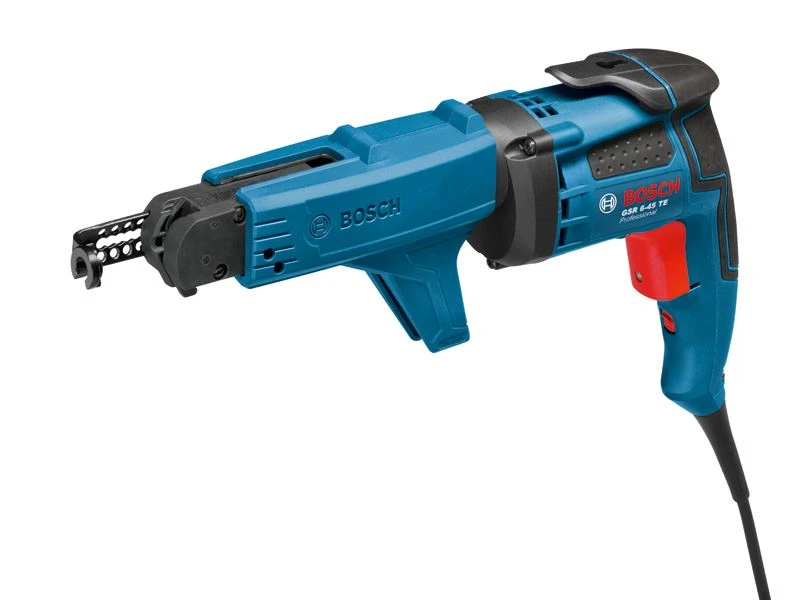 Trockenbauschrauber GSR 6-45 TE. Der universelle Trockenbauschrauber. Optimale Abstimmung von Drehmoment und Drehzahl ermöglicht vielfältige Anwendungen. Komfortables Arbeiten durch ergonomische Bauweise und mit einer Hand bedienbaren Tiefenanschlag. Präzise Verschraubungen auf konstante Tiefe durch exakte Abschaltkupplung. Hohe Leistungsreserven dank starkem 701-Watt Hochleistungsmotor. Breiter Elektronikschalter mit Feststellknopf für Dauerbetrieb. Rechts-/Links-Lauf. Praktischer Gurthalteclip zum Einhängen des Gerätes. Genormte Werkzeugaufnahme zum Einsatz handelsüblicher 1/4 Zoll-Einsatzwerkzeuge. Ausgelegt auf die Verwendung mit Magazinaufsatz MA 55. Handwerkerkoffer (2 605 438 620), Tiefenanschlag (2 607 002 585), Universalhalter magnetisch (2 607 000 157), 1 x Schraubendrehereinsatz (Bit) Ph 2, Gurthalteclip (ET-Nr. 2 601 329 113).