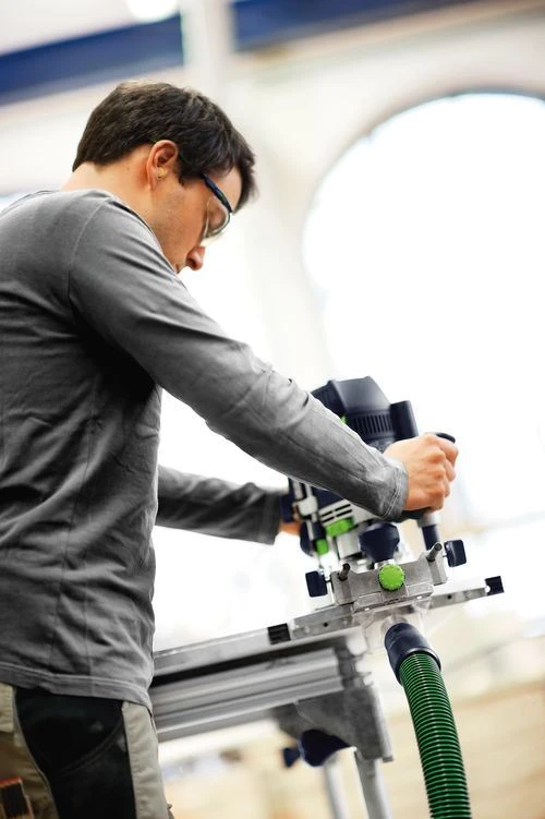 - Bis zu 99 % Absaugung beim Kantenfräsen durch absenkbaren Absaugring und Spanfänger