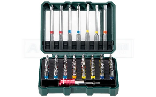 L= 25 mm (48 St.): PH 1 x 3, PH 2 x 3, PH 3 x 3; PZ 1 x 3, PZ 2 x 3; PZ 3 x 3; SL 4 x 2, SL 5 x 2, SL 6 x 2; H 3 x 1, H 4 x 1, H 5 x 1; T 10 x 2, T 15 x 2, T 20 x 2, T 25 x 2, T 27 x 2, T 30 x 2, T 40 x 2; Torx Tamper: T 10 x 1, T 15 x 1, T 20 x 1, T 25 x 1, T 27 x 1, T 30 x 1, T 40 x 1