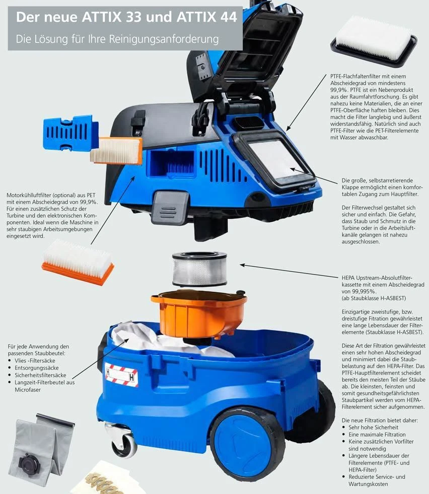 Auch bei anspruchsvollen Feinstaubanwendungen bleibt so der Aufwand für Filterwartung gering. Einfache Handhabung und Benutzerfreundlichkeit sind die Attribute des ATTIX 44.